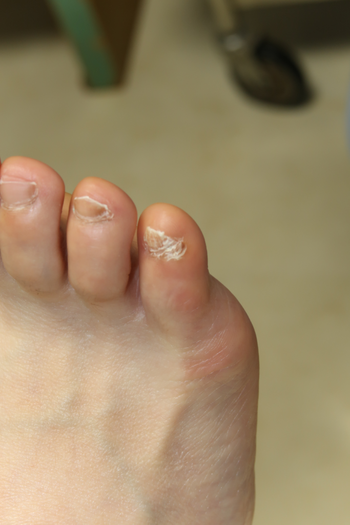 特にヒールを履いている方や足幅合わない靴を無理にはいたり、靴ひもを締めずに靴の中で足が遊んでいしまったりしていると、第5趾の爪が曲がったり、二つに割れてしまったり、分厚くなったりと様々な変化を起こします。