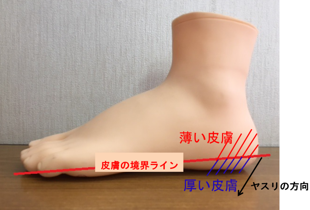 ケアする際には足のかかとの皮膚は厚い部分と薄い部分があります。その境界ラインを意識しましょう。