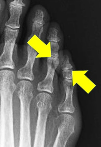 レントゲンで見るとその原因がよくわかります。ご覧のように第4趾の中節骨の張り出しと第5趾の末節骨の張り出しがちょうど当たる位置になってしまうと、骨と骨が当たってそこに痛い胼胝が出来るのです。