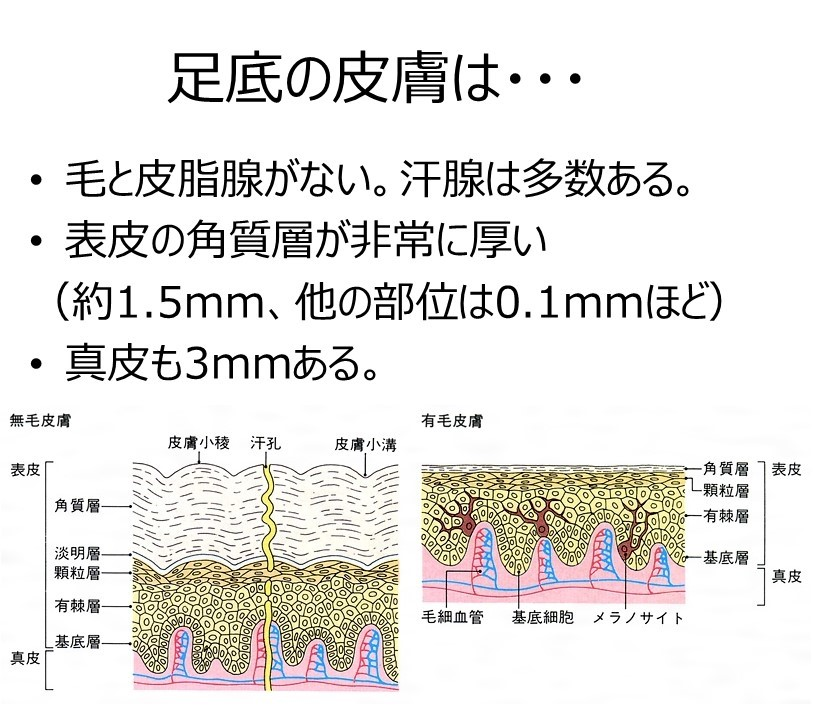 足底の皮膚は汗をかく汗腺が多く、真皮も角質が非常に厚くなっています。
